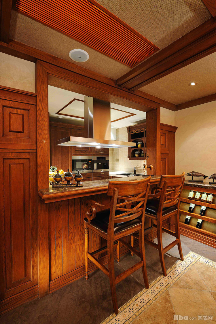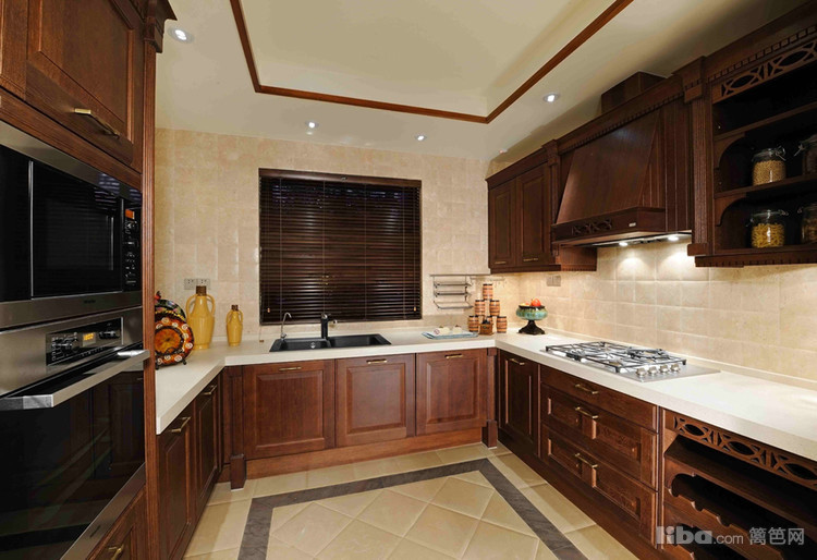 厨房简约的乳白色瓷砖淡化了深棕色橱柜带来的厚重感。