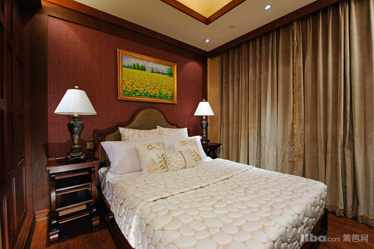 主卧大红色的窗帘给人热情奔放的感觉。