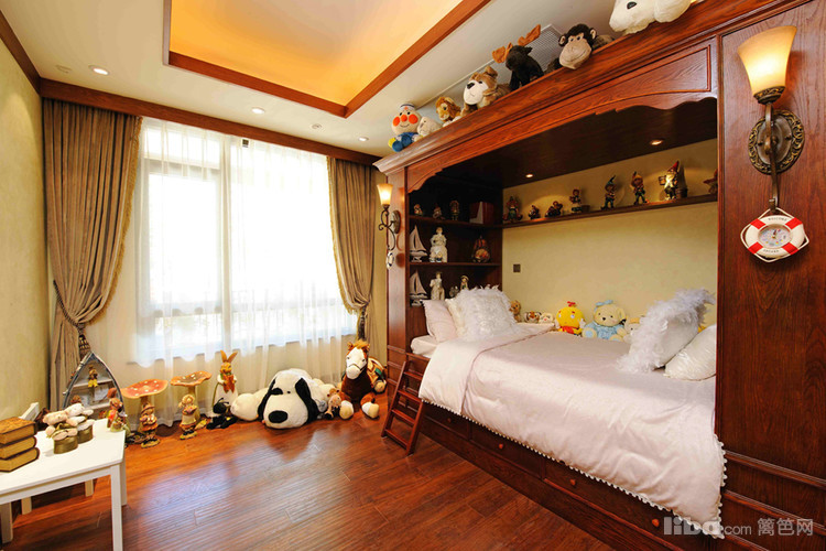 儿童床给予了孩子充分的安全感,室内摆满了孩子喜欢的手办和娃娃。