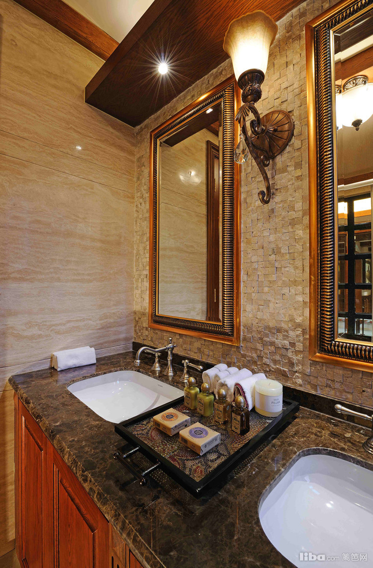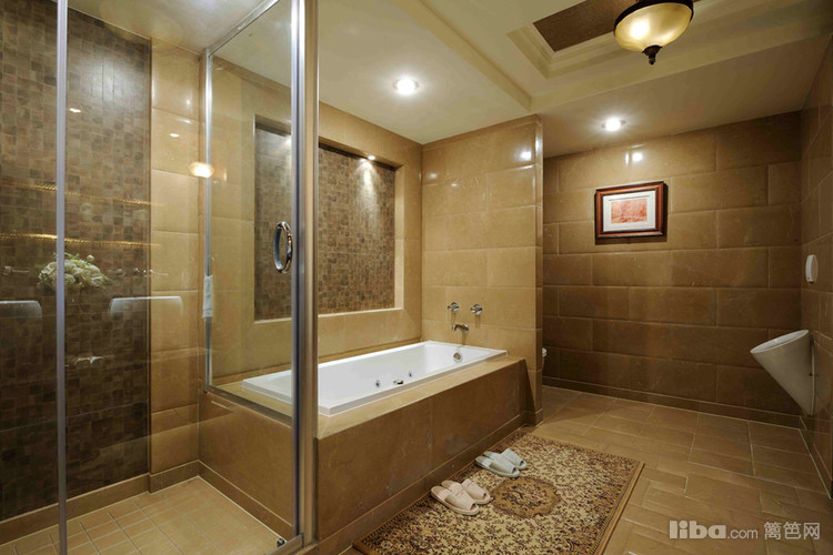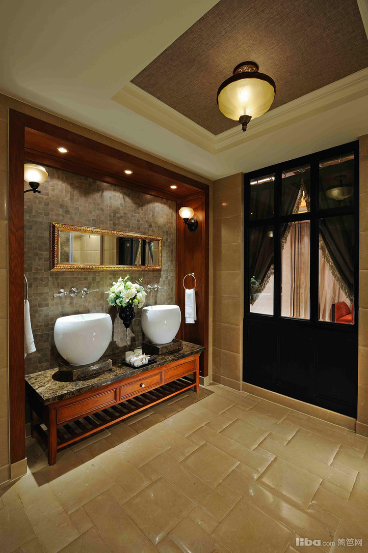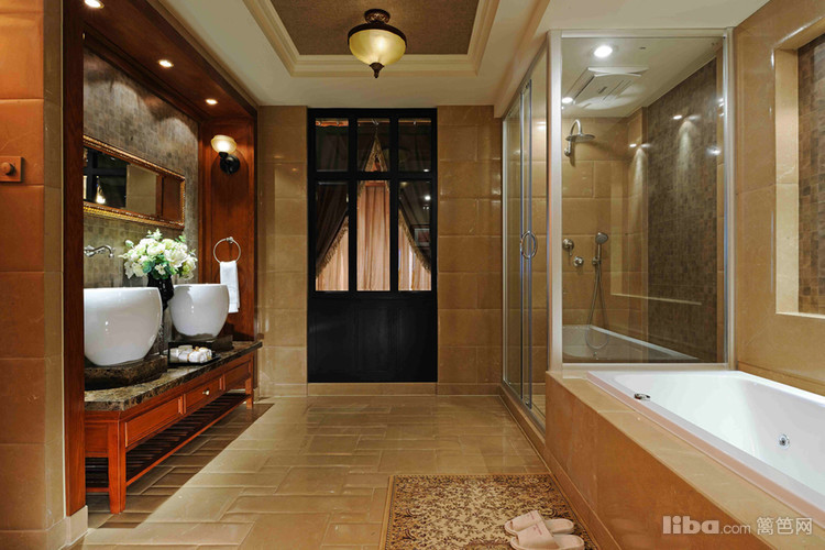 主卫浴间双台盆的设计缓解了洗漱的压力,同时在宽敞的空间中设置了浴缸和淋浴区。