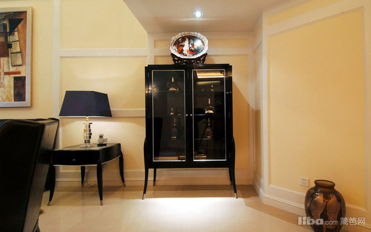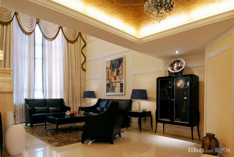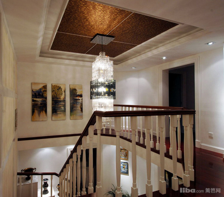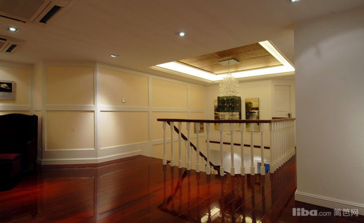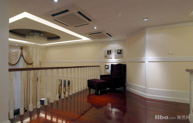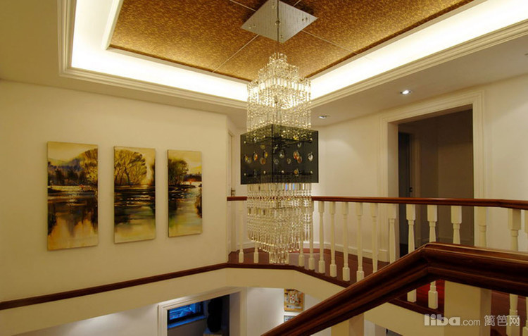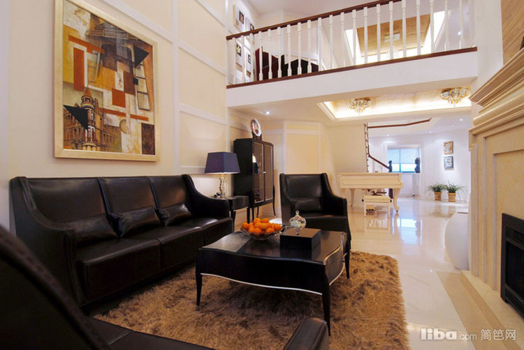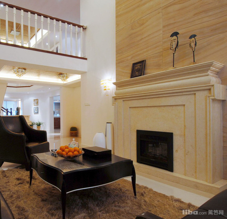 客厅省去了电视的设计,美式代表性的壁炉设计,石材铺贴的背景墙彰显大气之感。