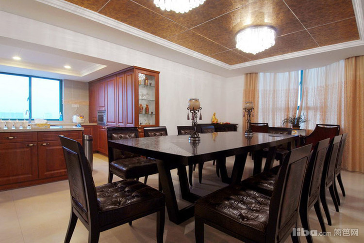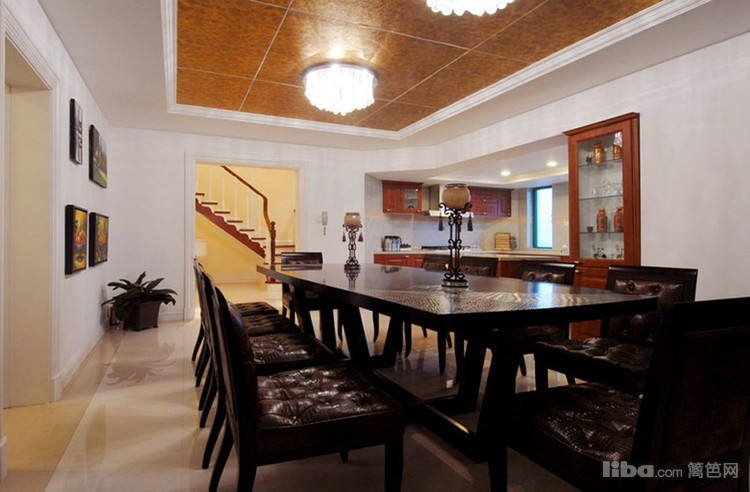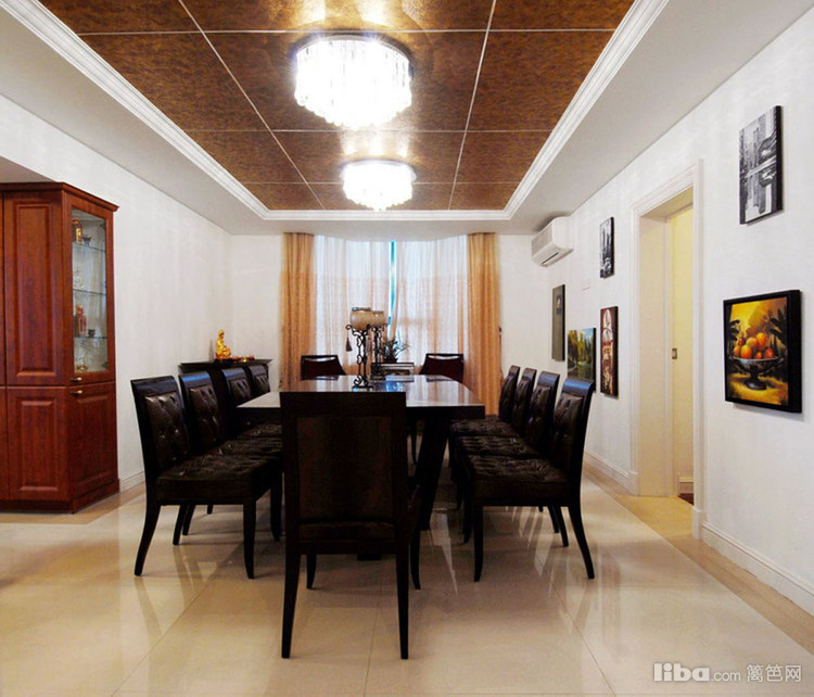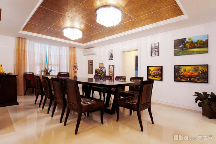 方形餐桌与吊顶相统一,白色墙面铺贴了大量的油画来装饰,为空间带来了浓郁的艺术气息。