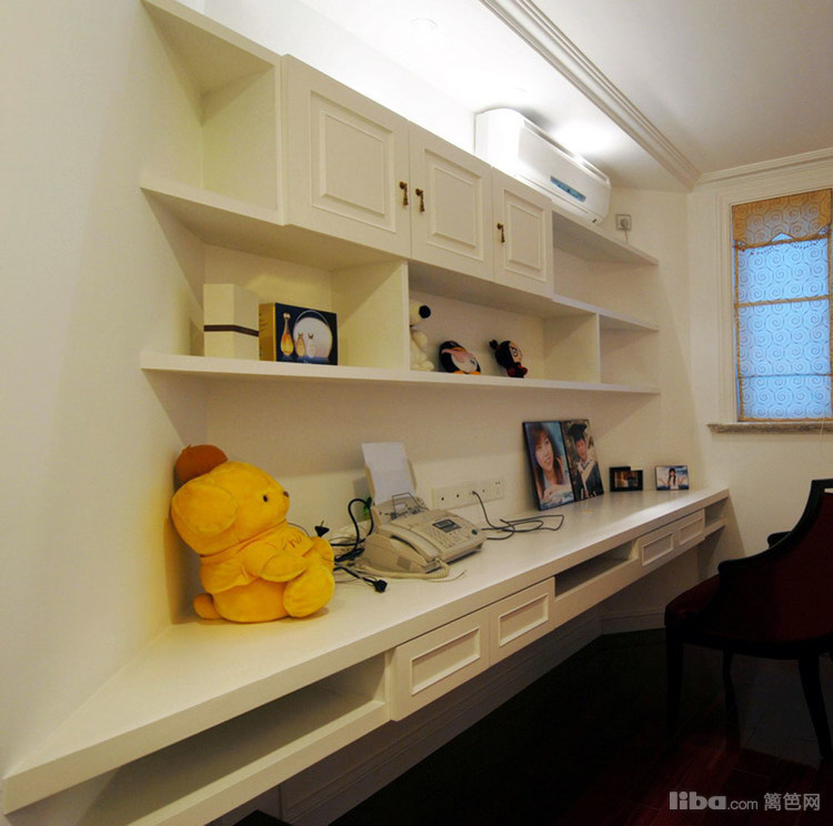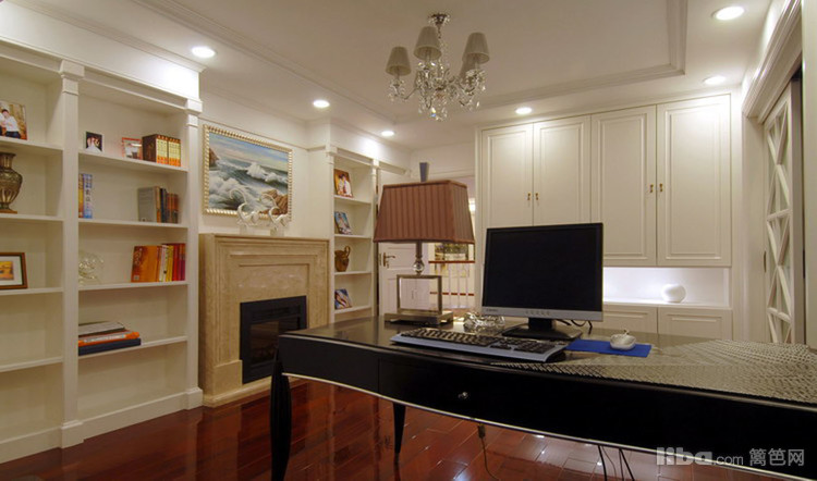 书房整体也是清新素雅的色调,深色地板和书桌为空间增添了稳重感,同时也有充足的收纳空间。