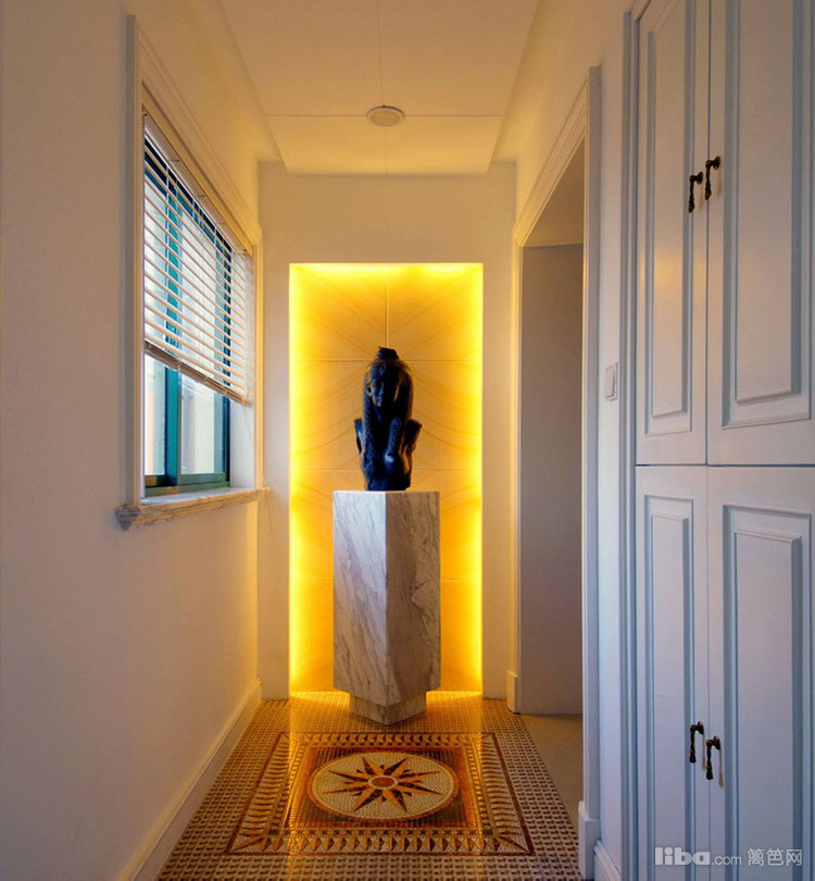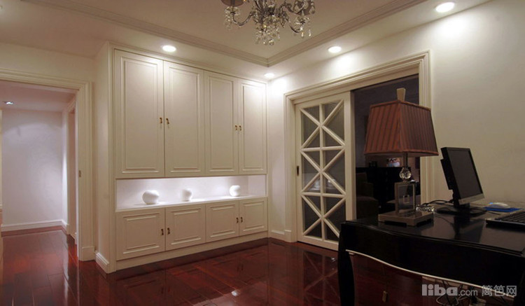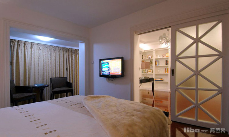 主卧包含一个书房,使用磨砂玻璃推拉门来分隔空间。