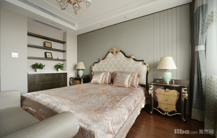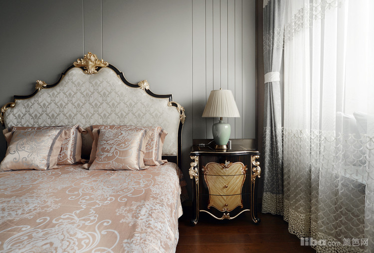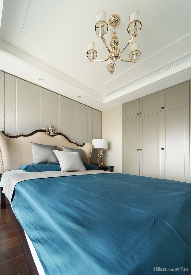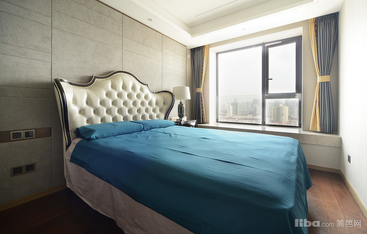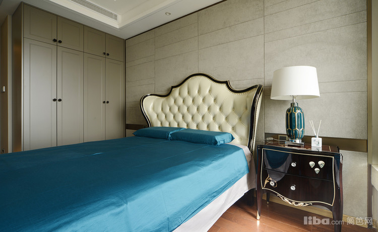 主卧的床头背景为灰色硬包背景墙,分割线条带出造型感。