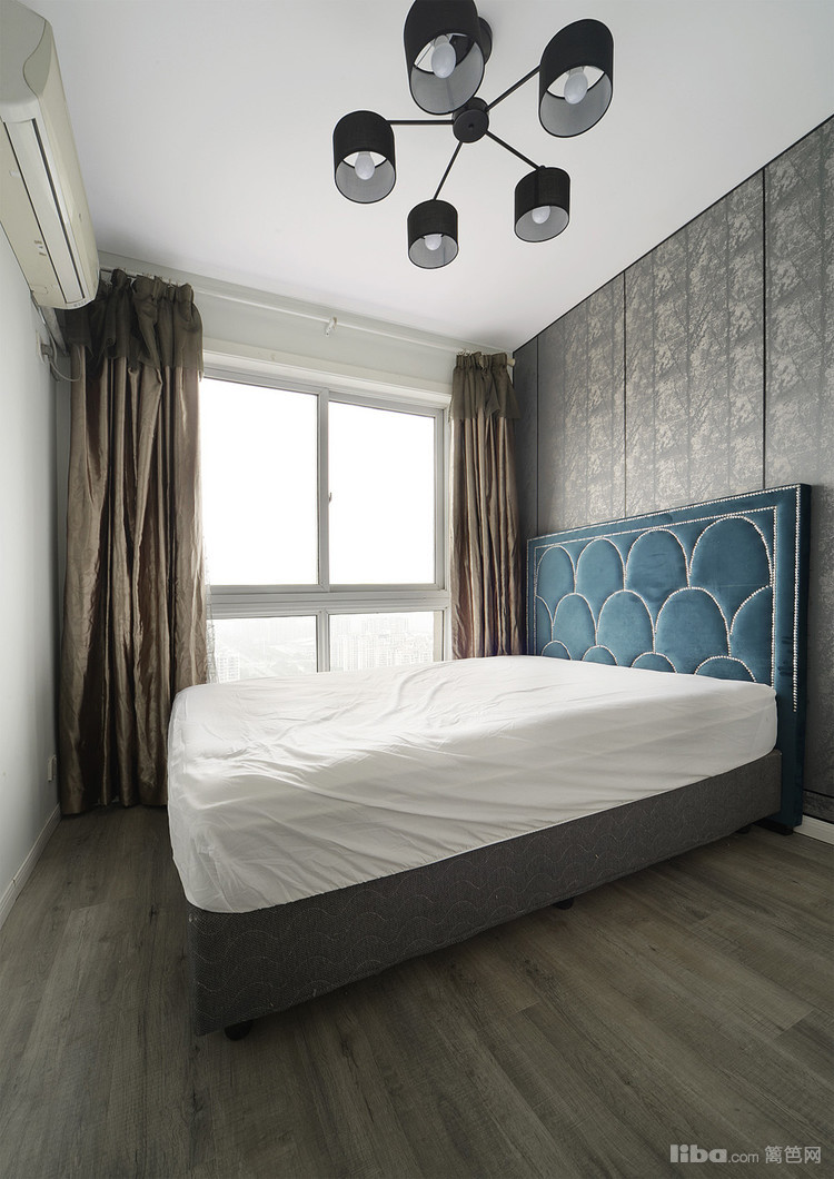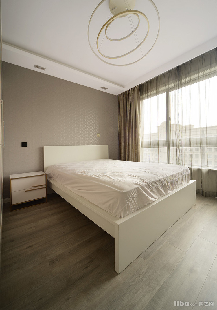 主卧的配色和客餐厅相统一,简约的吊灯不失时尚感,舒适稳重。