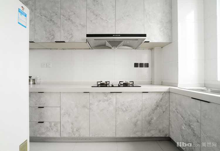 白色橱柜让不大的厨房空间敞亮开阔。