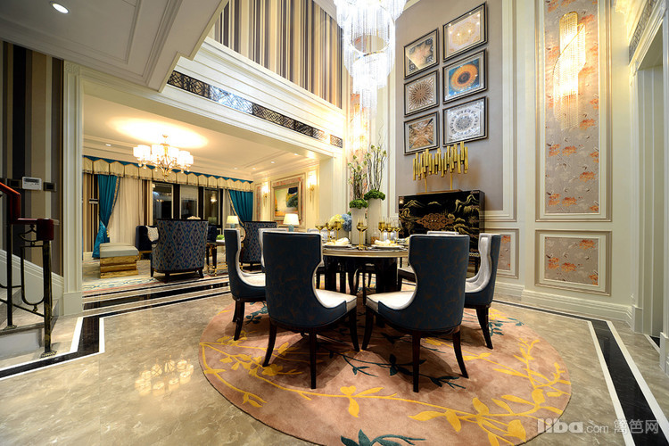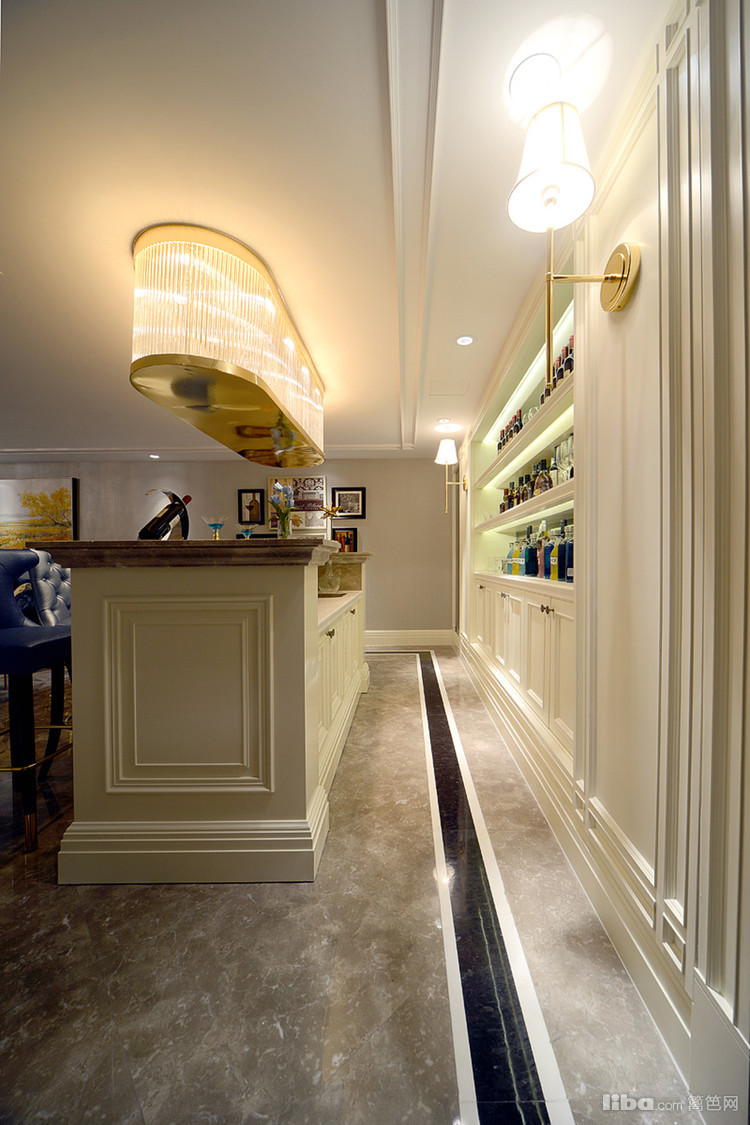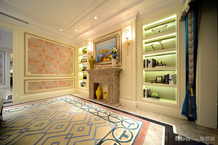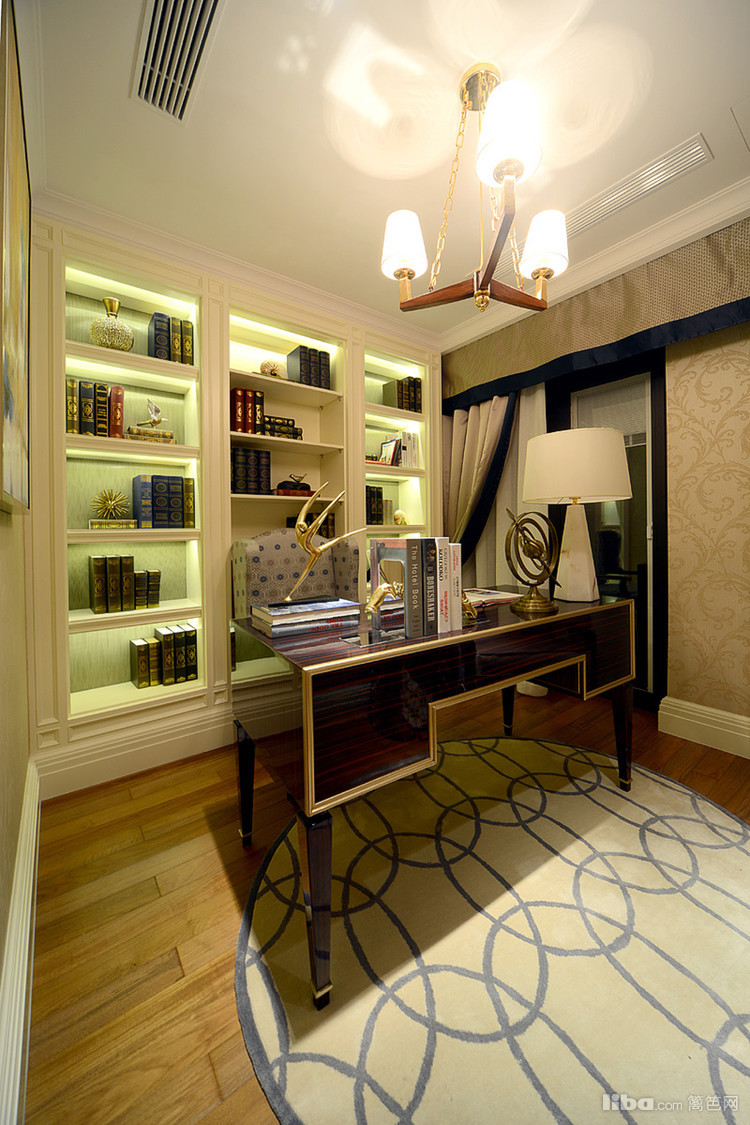 书房区域没有过多的装饰,仅用了简易的新古典书桌加之圆形的地毯,书柜的灯带营造出了整个书房独特的氛围。