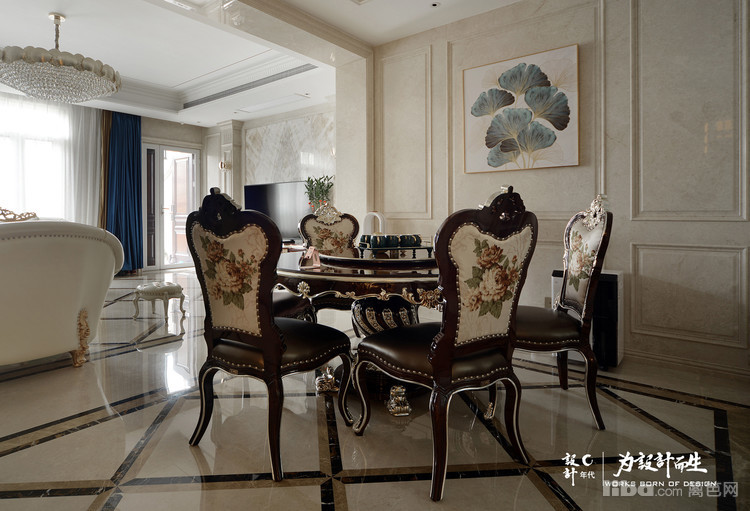 餐厅古典的餐桌椅因为金色雕花而瞬间高傲精贵,营造出温馨浪漫的用餐环境。墙面低调的中性色在空间和谐相融,给人宁静舒缓的心灵感受。