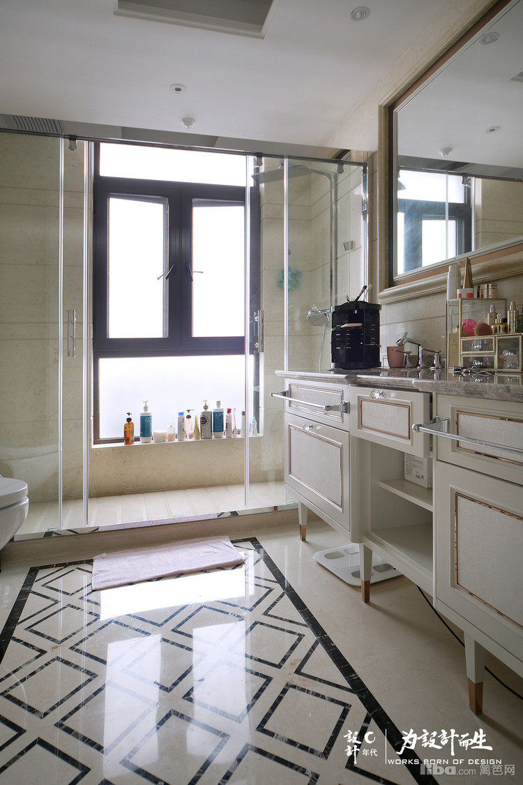 主次卫生间都以米色系为主,空间布局随意自在,主卫生间地面深浅拼接,给人精巧之感,塑造出一个轻松的环境。