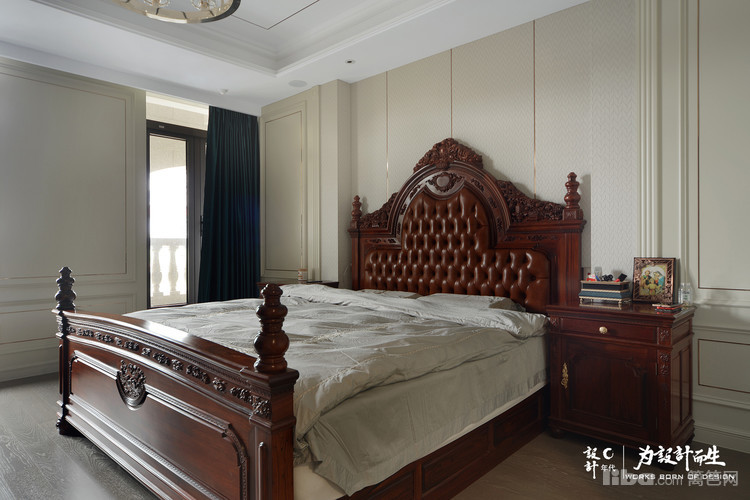 棕色的实木床稳重、大气而床背的雕花及软包皮革彰显了贵气,时尚的米色墙纸搭配金色金属线条加上墙面同色石膏线丰富了整个空间,让人忘掉压力与烦恼,尽情享受生活的精致与美好。