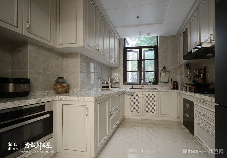 厨房间橱柜以白色木纹为主,金色线条点缀,清晰的纹理显出返璞归真的生活状态,在宁静舒缓中制作出美味佳肴。