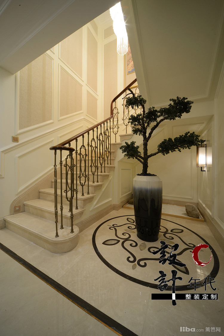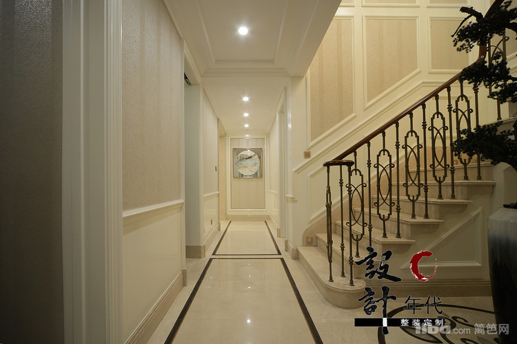 玄关楼梯的设计设计师从地砖上下功夫利用拼花大理石来打造延伸感和装饰性。