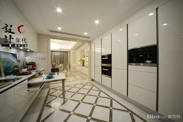 中西厨相结合的厨房空间,设计师把整面墙作为储藏功能让烤箱洗碗机和咖啡吧都有了很好的规划。