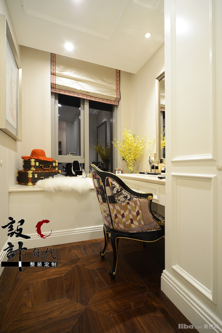 在合理空间的利用上设计师单独的规划出一个梳妆区域满足了女主平时日常梳妆打扮的需求。