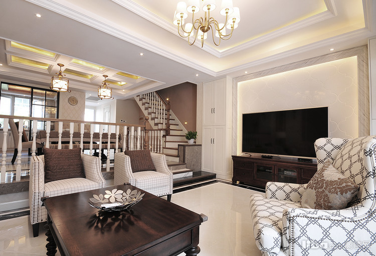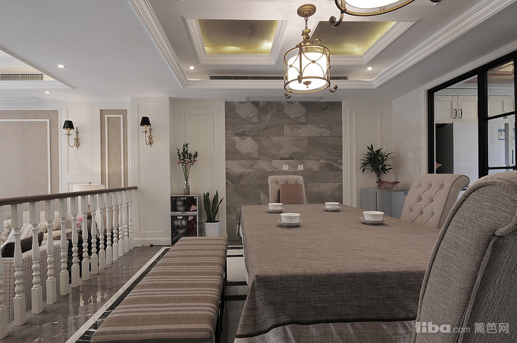 客餐厅 是南北错层通透,先天优势,通过线条,墙板墙纸,有效的灯光营造的暖暖氛围。