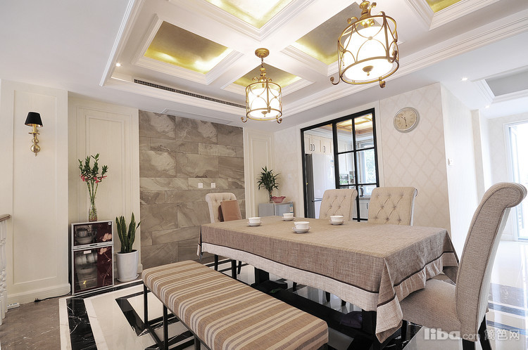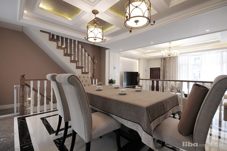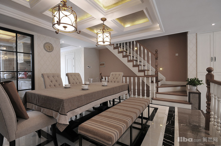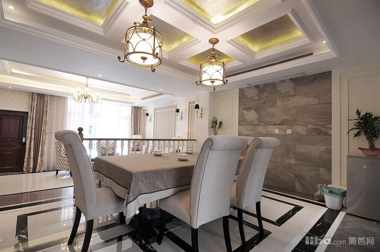 餐厅用布衣的餐椅搭配上硬朗的大理石地面,刚柔结合的场景恰到好处的使得空间变得柔和温馨。