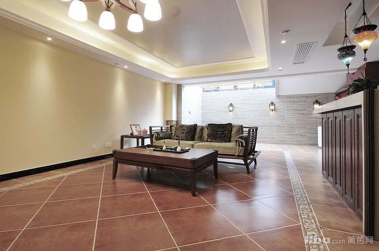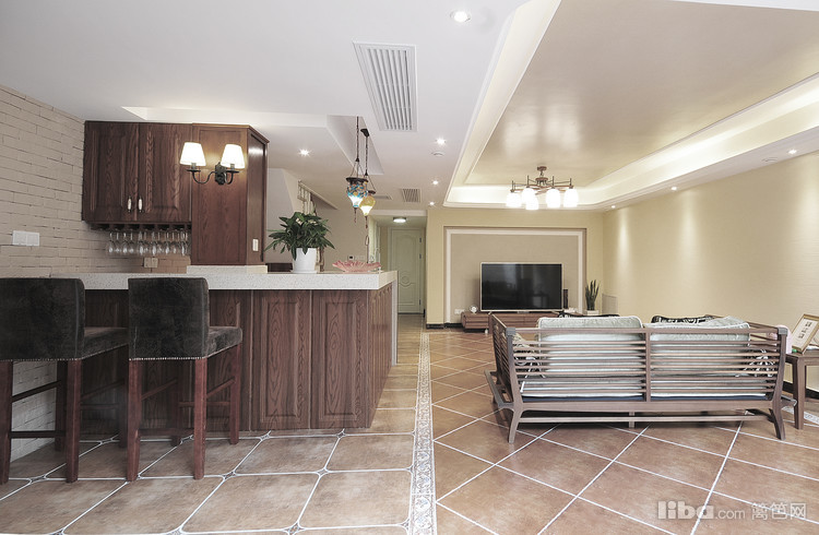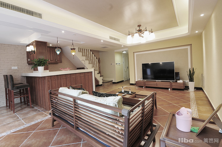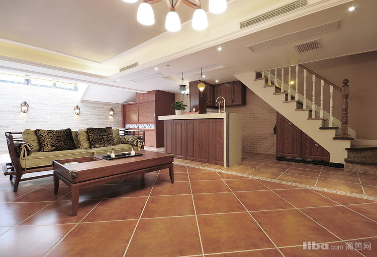 地下室作为平日的休闲区设计师用两种不同规格的地砖和吊顶造型分隔出了吧台区域和会客区域。