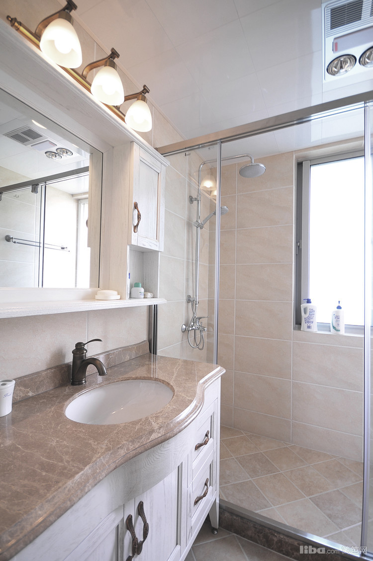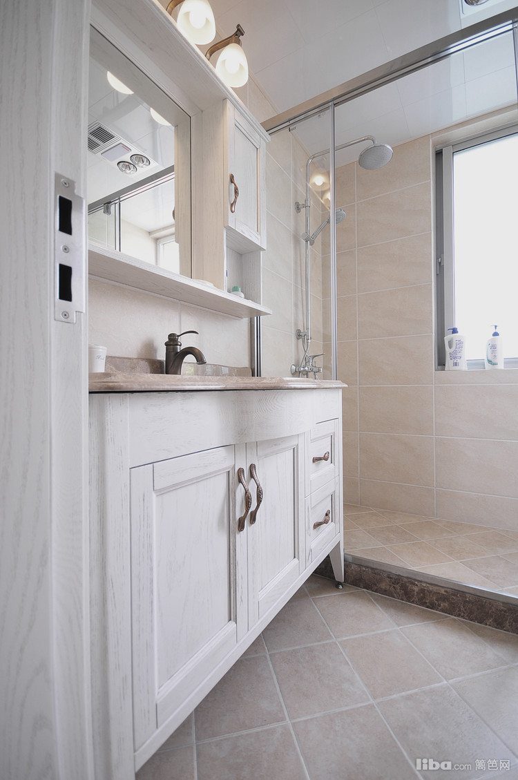 主卧的卫生间;设计师把镜子与置物柜结合在一起解决了日常夫妻二人的洗漱用品和化妆护肤品的置放。