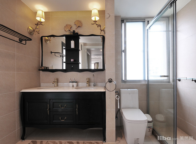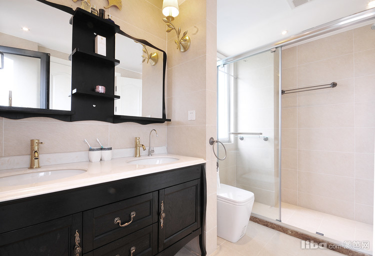 卫生间设计师采用沉稳的黑桃木色调的镜面台盆柜加上功能上的划分,在安全,防滑上面的做了些小细节的设计。
