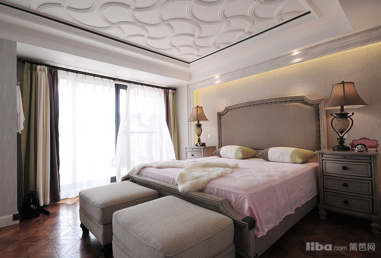三楼整个都是她们夫妻两个人的天地!顶上的丝带就代表她们的无形的爱,温暖舒适温馨是这个卧室最大的优点,也是她们每天这么爱自己家的关键所在.。