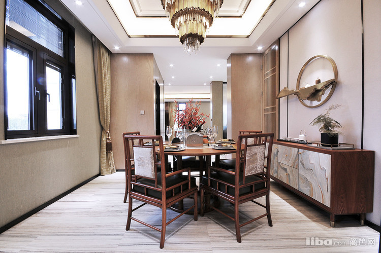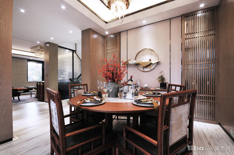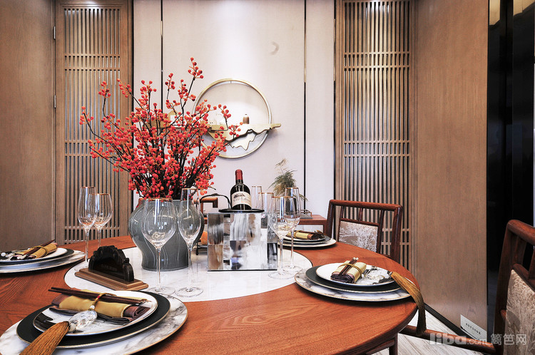 餐厅区域搭配保留了中式圆桌团团圆圆的理念在配色和装饰品选择上加入了现代风的元素。