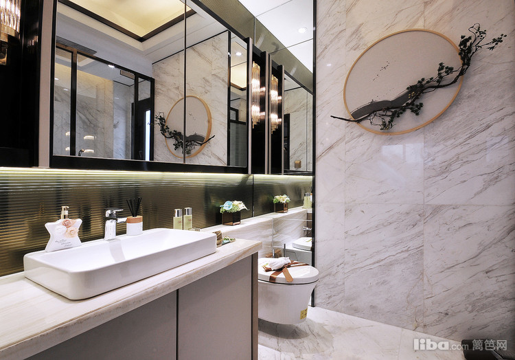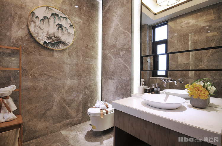 卫生间的搭配上设计师为了打破硬装上冷色调的大理石给人以冰冷的感觉,所以在墙上加上了中式风格的装饰挂画山水草木,给空间上增加了柔美和温馨的感觉。