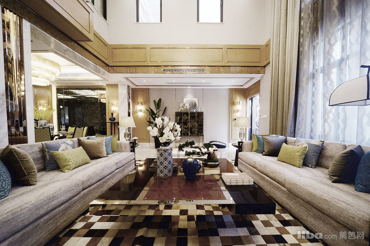 客厅部分设计师将业主对中华书画文化的历史底蕴在设计上表现的淋漓尽致。并与之与现代装饰相结合搭配出了别具一格的现代中式风格。