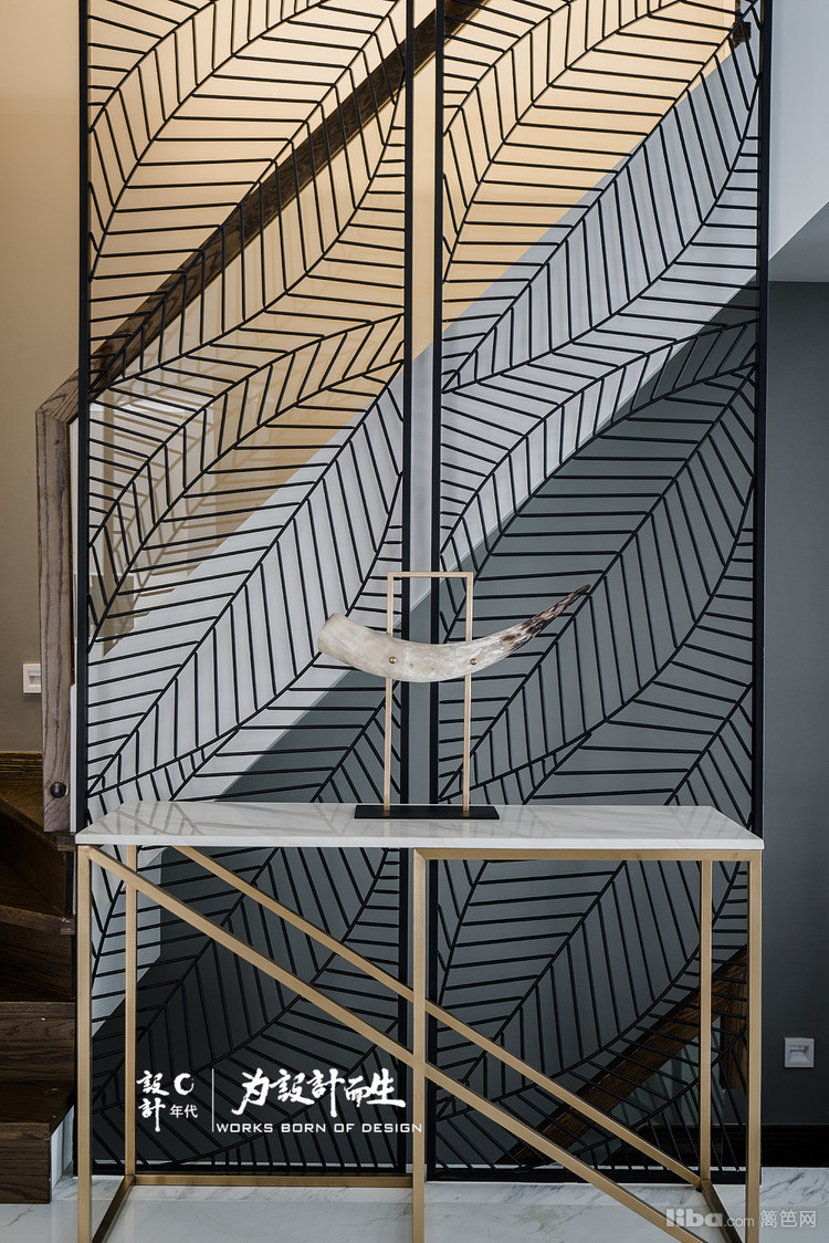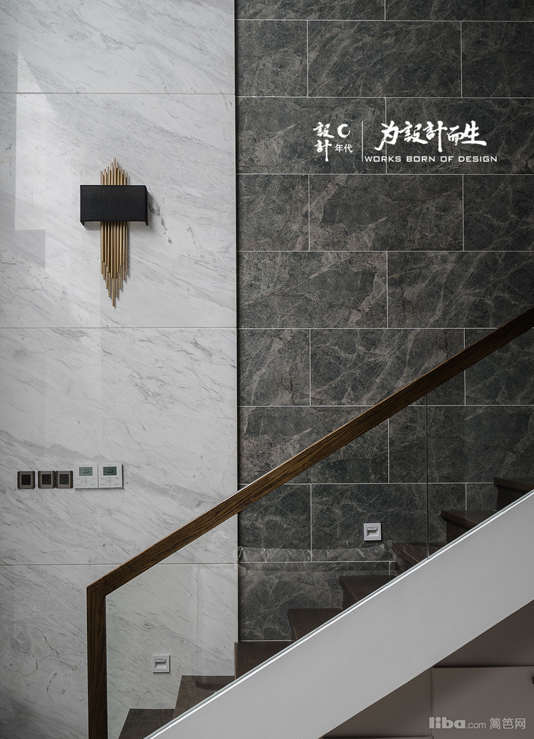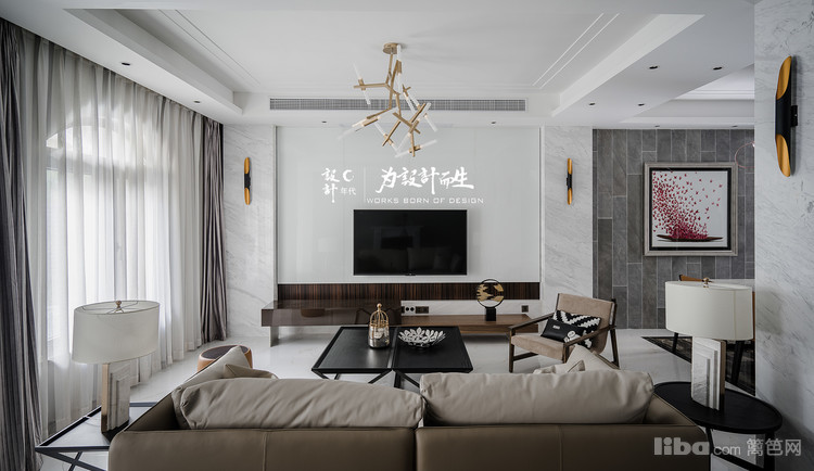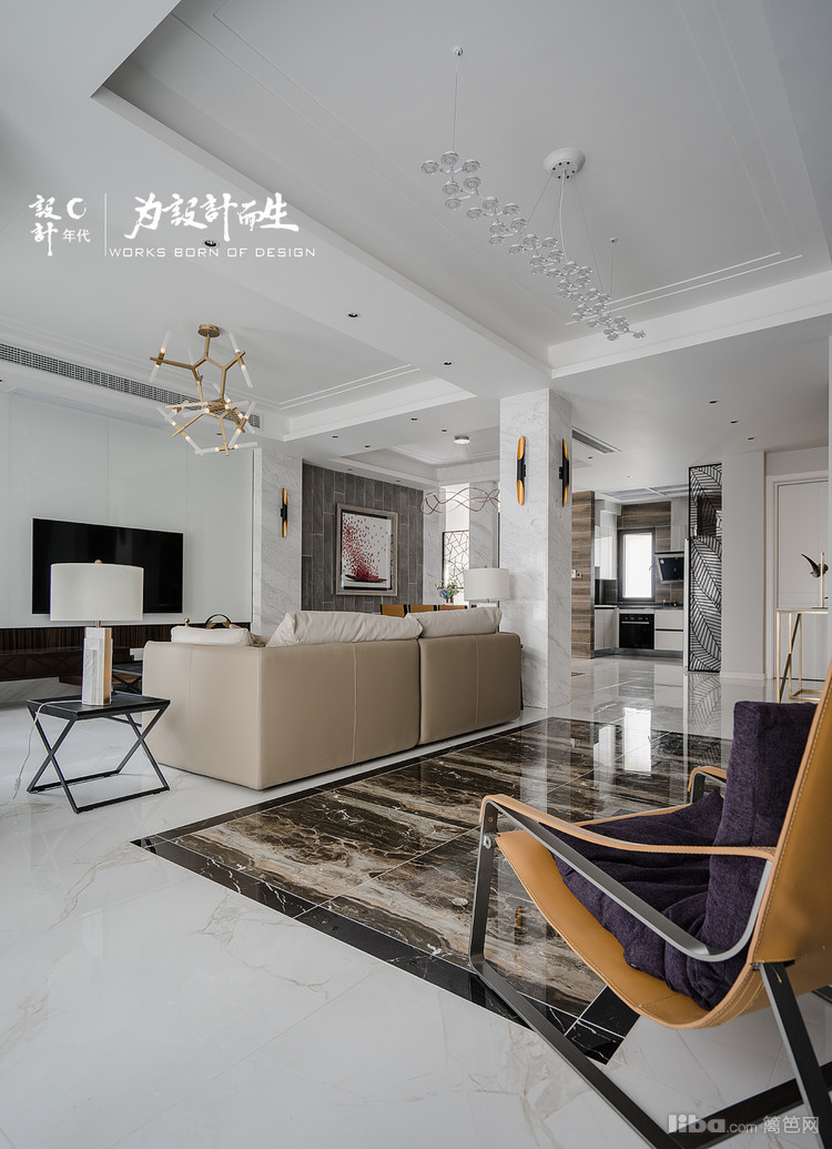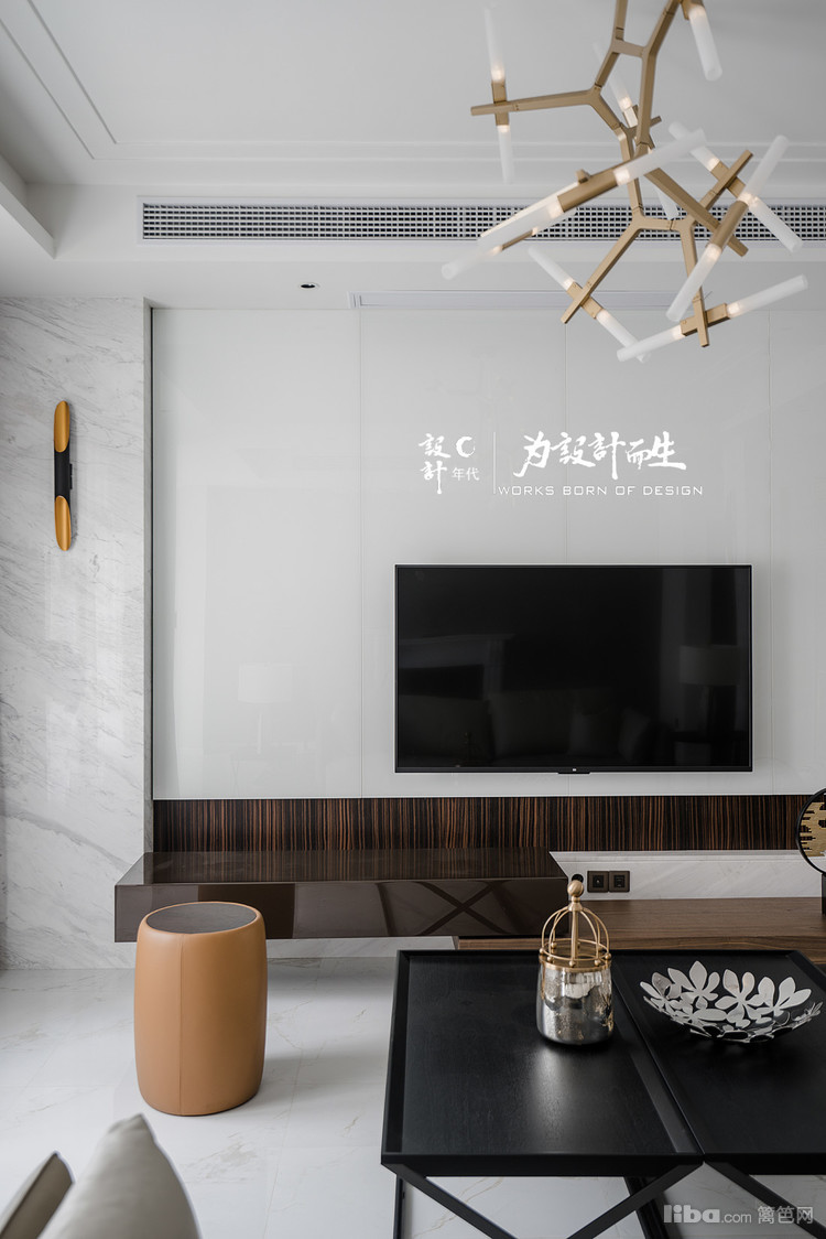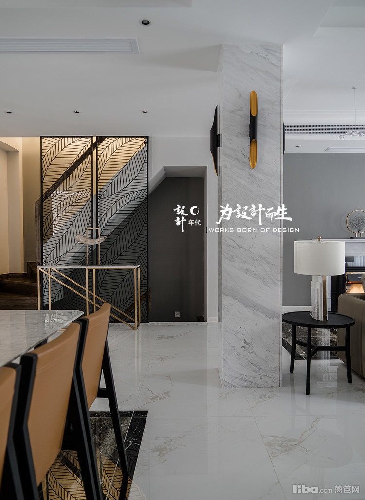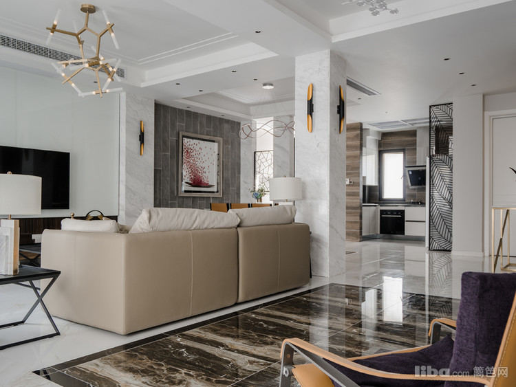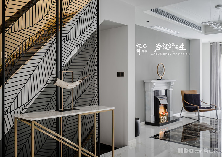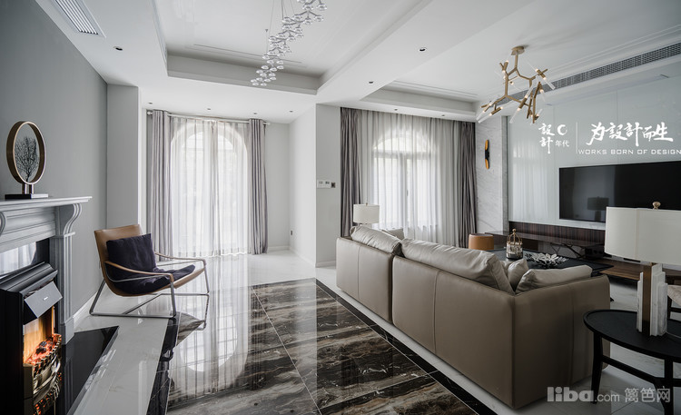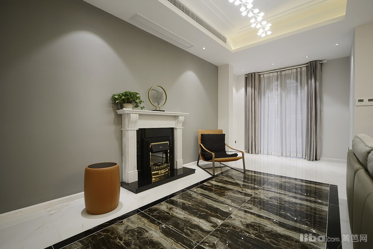 客厅沙发背景采用了现代流行的工业风格清水漆装饰配上欧式壁炉,给人以简约整洁的视觉效果。电视背景则为一整幅的爵士白大理石。