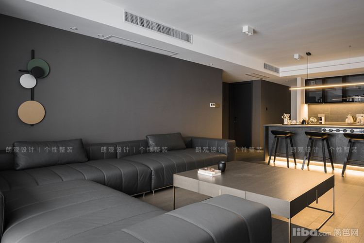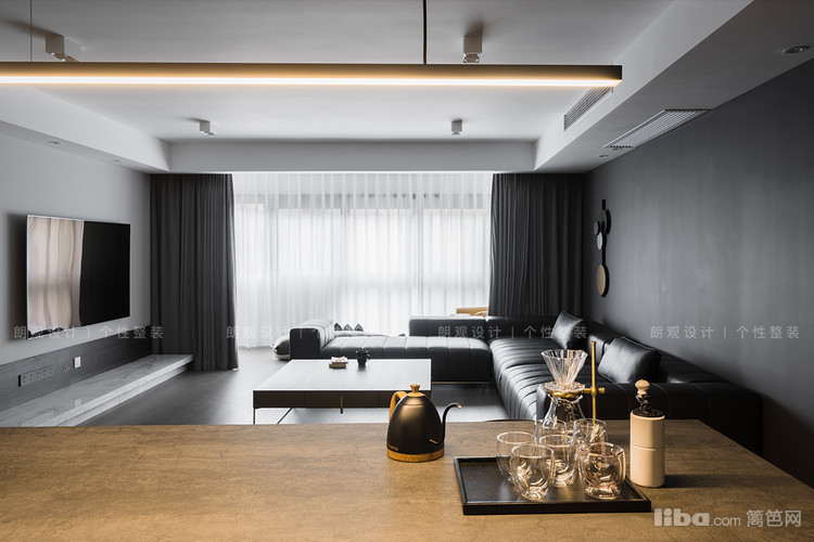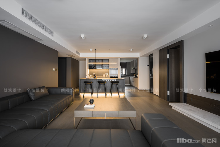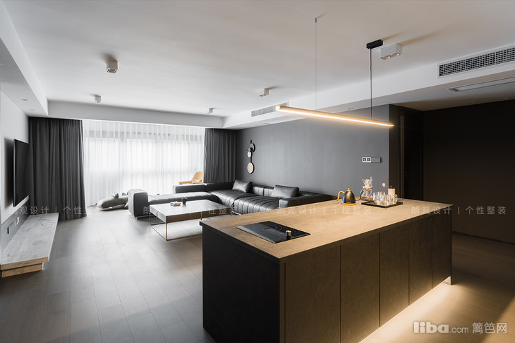 客厅黑白色调重叠平分,沙发墙和木地板选用不同的灰色系,打造出空间的质感;电视背景墙到天花板则一致采用白色打底,搭配暗色系大件沙发,增加整体空间层次感,更显利落和硬朗。