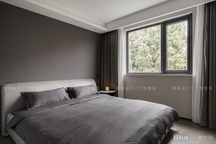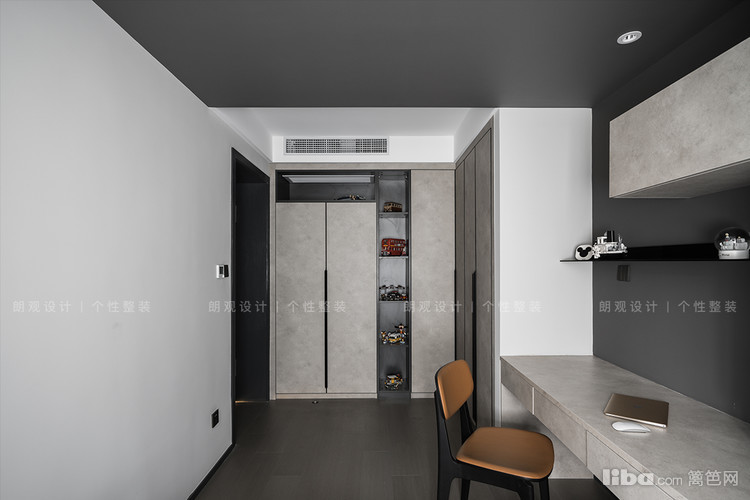 主卧延续了一贯的暗色系,背景墙用优雅的灰色涂漆和温暖的地板做拼接,搭配温和的灯光,让休息空间拥有静谧感。次卧衣柜则采用白色,巧妙搭配金属质地的边几充当床头柜,整体氛围更加温暖。