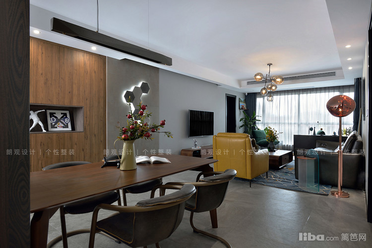 拆除原始户型中的定制柜和地台,客餐厅区域铺设同一型号的地砖,可以延伸视觉感,使得空间更加通透交融。