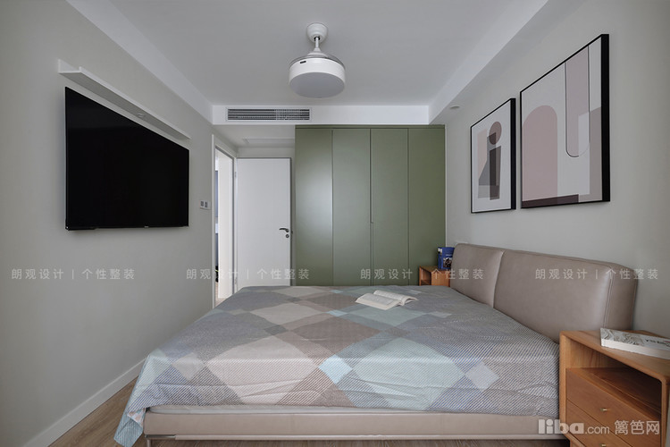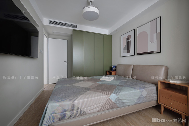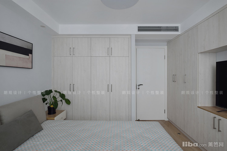 将衣柜、书桌、床边柜,设计于一体,并留出了搁置电视机的台面,干净利落,又不影响整体设计风格