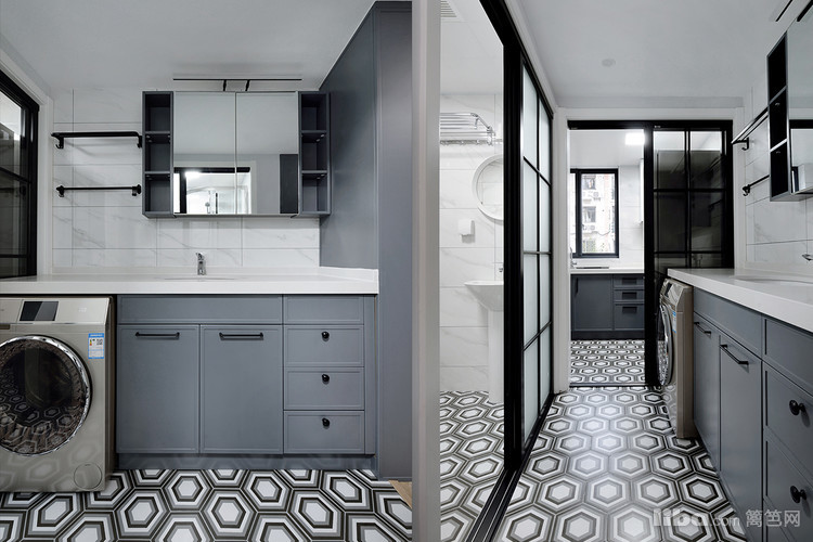 干湿区之间是通往厨房的过道,所以要留足空间方便过人,因此卫生间选择了不占空间的推拉门。