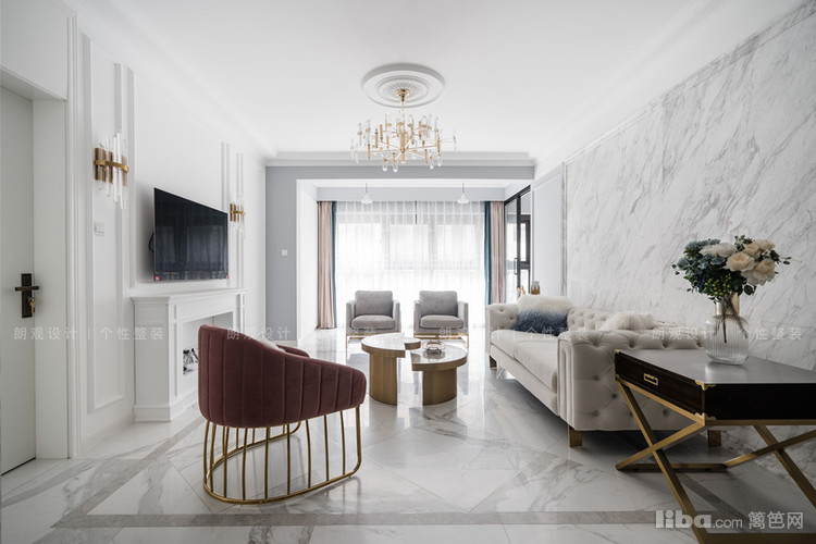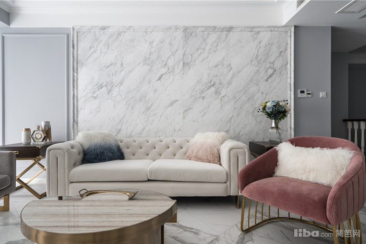 装饰着大理石的沙发背景墙,留白至简的格局,使得整个空间极富感染力,营造出一种低调的奢华美感。