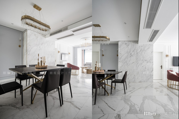脏粉色的沙发在这个冷色系空间起到了平衡作用,渲染出落落大方的轻奢韵味。
