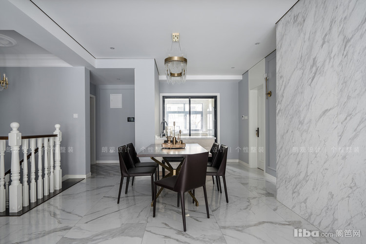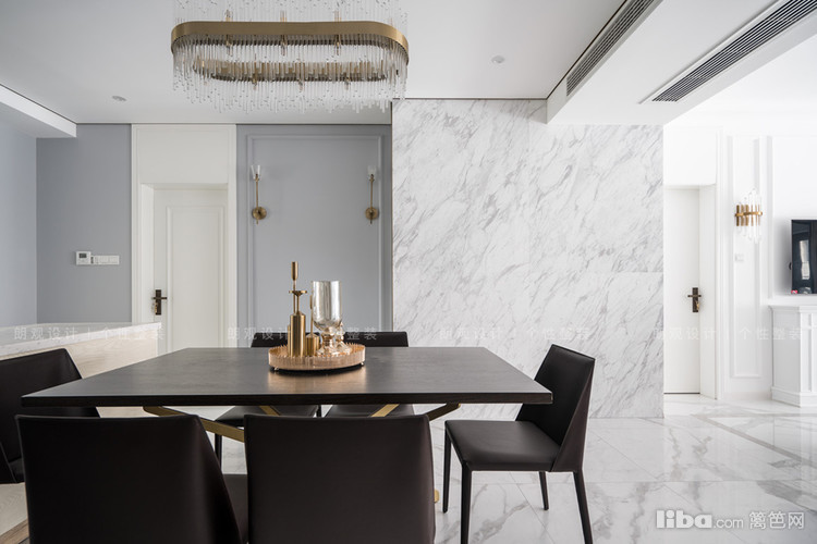 一整面的大理石背景墙同样采用留白设计,与客厅沙发背景墙相呼应,空间感和谐统一
