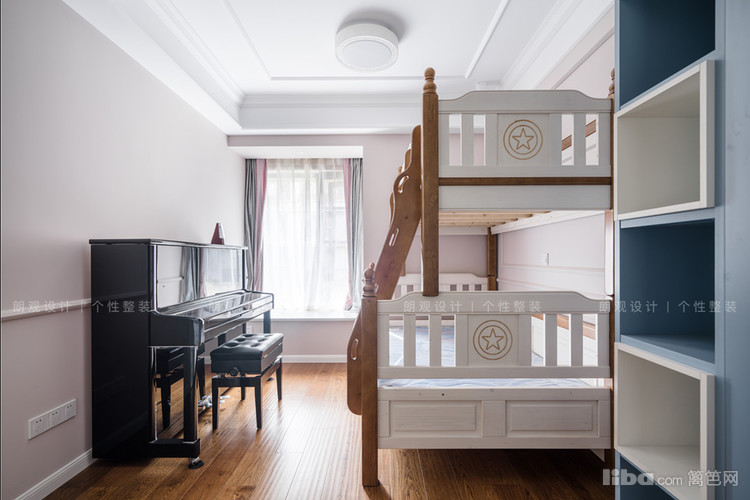 儿童房采用了较为明亮轻快的配色,浅粉色的墙体搭配淡蓝色的储物柜,简单的陈设却可以赋予孩子无限的想象
