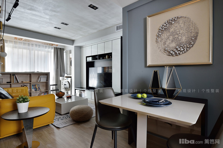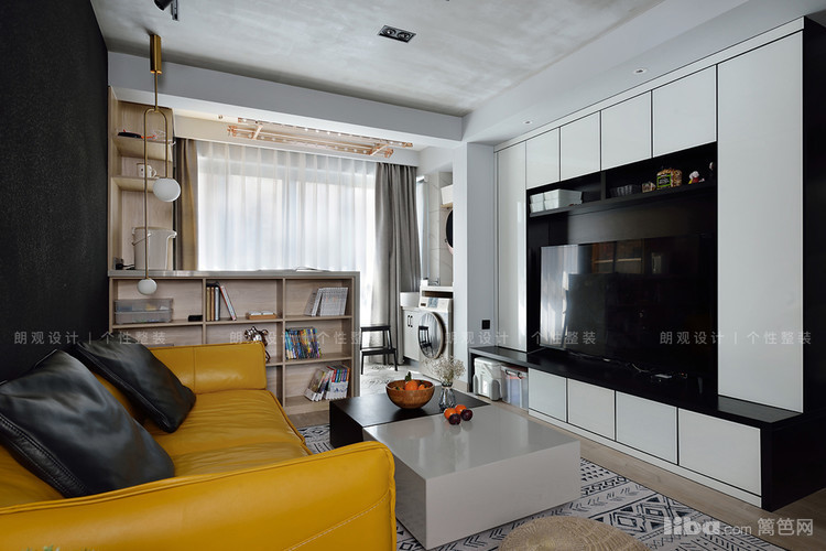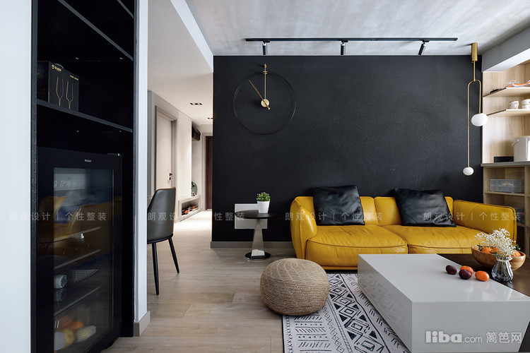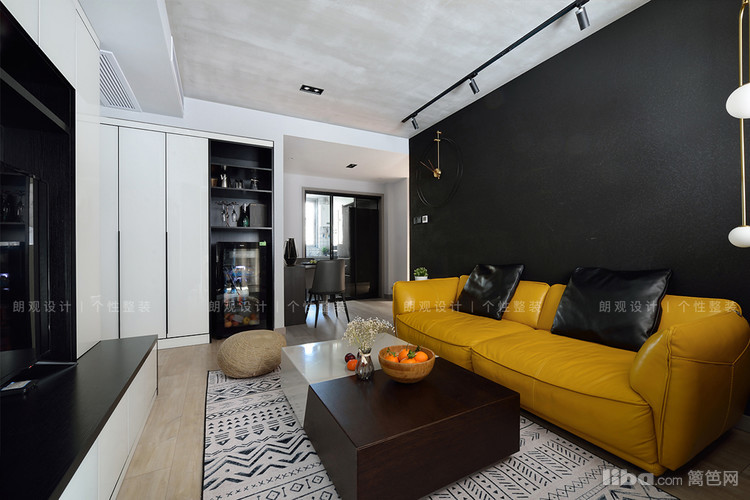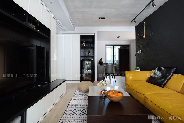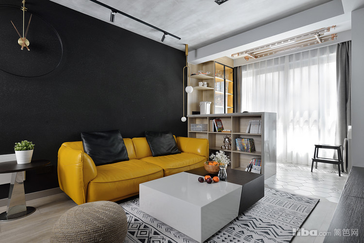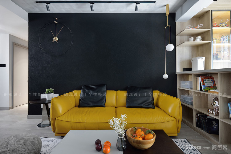 客厅在白色基调上,大胆采用抓人眼球的黑色,软装上则用明亮的黄色进行撞色处理,跳脱平凡