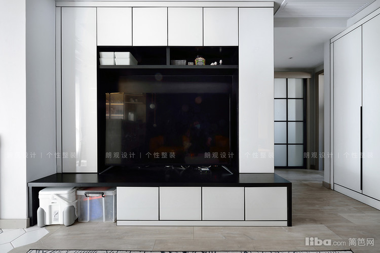 储物柜中间预留空间搁置电视,同时为了维持空间的整洁,在墙面开槽穿管解决电线杂乱的问题。