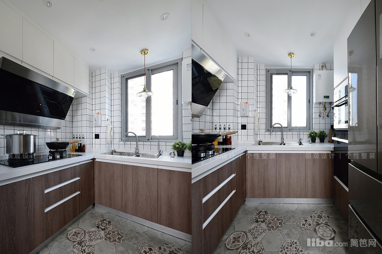 厨房内部将水槽、操作台、炉灶、冰箱沿着墙排成U型,将贮藏区和烹饪区分别置于U字的两侧,满足日常的厨房用品的收纳,让烹饪者有高舒适度的烹饪享受。