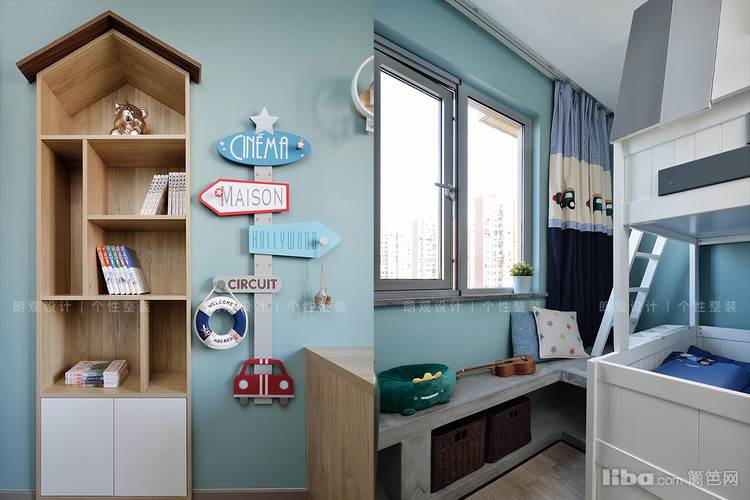 敲掉门背后的墙体,为孩子嵌入了一个“房屋形”书柜,嵌入式设计完全不影响房门的使用