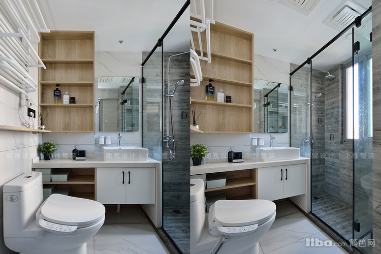 卫生间内部利用淋浴房做了干湿区分离,白色与木色的结合,让空间简洁明亮,浅色的色调在视觉上让空间更宽敞。