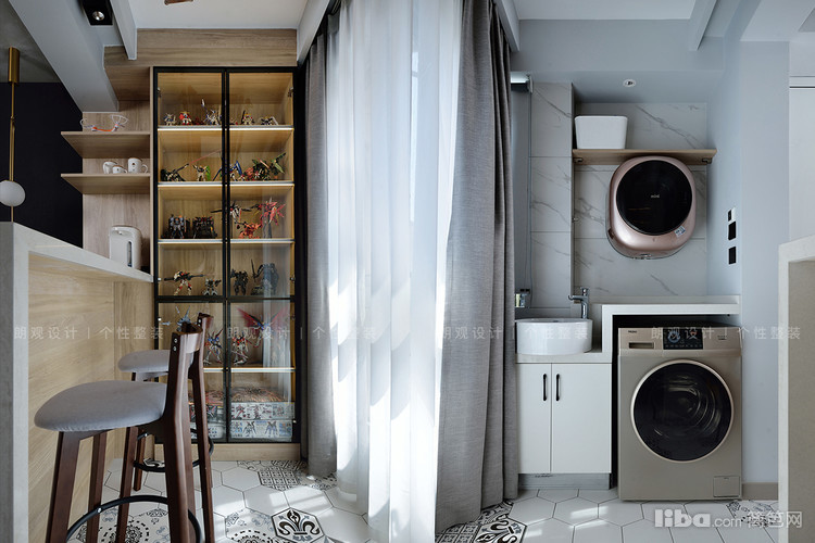 阳台兼具实用性和娱乐性,一面放置洗衣机,满足传统晾晒需求;一面布置成屋主的模型柜,平时可以在这里拼模型,喝茶等。