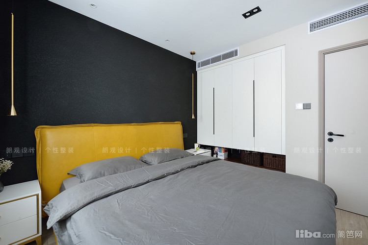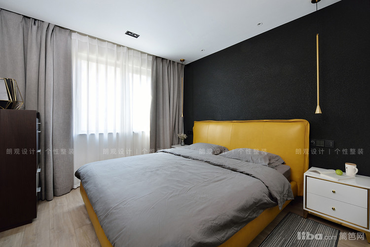 主卧延续了客厅的设计风格,背景墙同样采用了黑色的硅藻泥。为了让空间亮起来,选择了沙发的同系列床具,搭配金属吊灯,时尚感强烈。