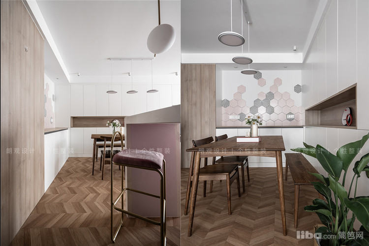 餐厅墙面以白色涂漆为基底,点缀六边形花砖,结合木质元素,不同材质在同一空间形成视觉上的碰撞,诠释别样的优雅。