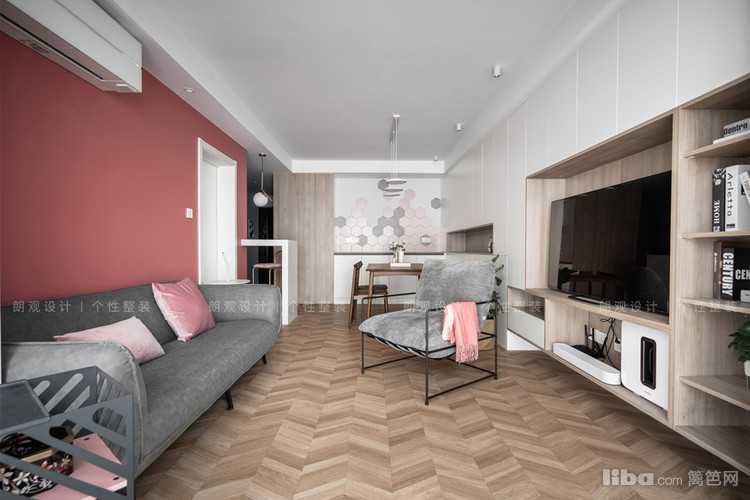 客厅在简约的空间基础上,沙发背景墙延续了热情洋溢的红色,让客厅拥有独特的时尚视觉感