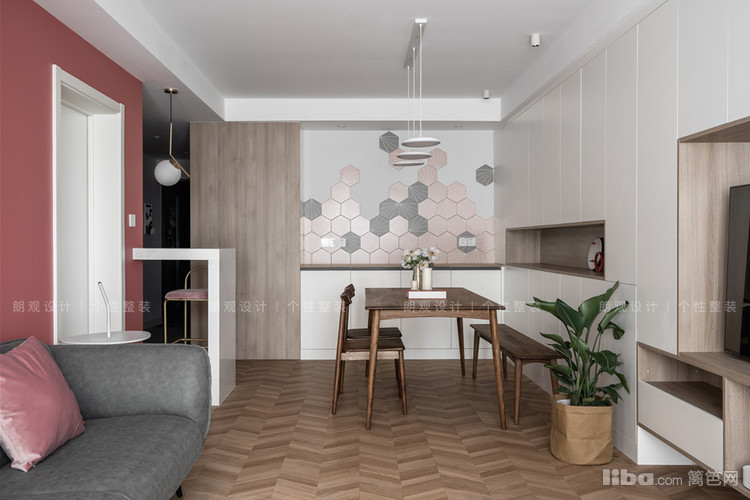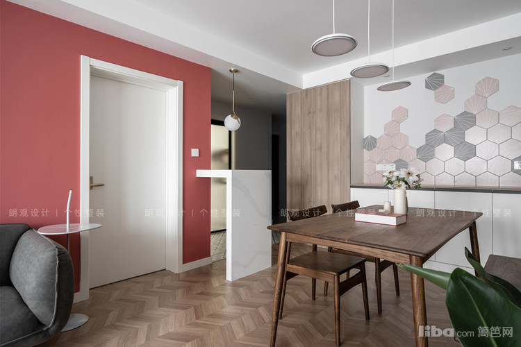 一入门厅,就被温馨热情的玄关端景吸引,设计师用饱和度较高的西瓜红黑板墙做背景,以装饰吧台代替传统的玄关柜,搭配金属灯饰、粉红色座椅、简单的小摆饰,让空间显得更加华丽精致。