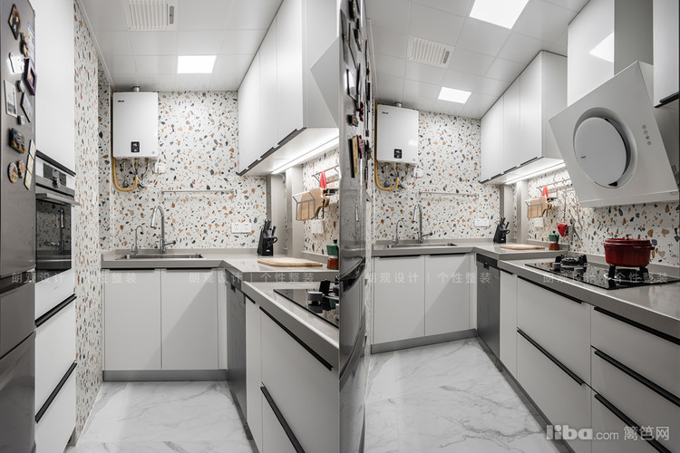 厨房区域以白色为主,搭配水磨石墙面,让白色整体橱柜看上去更加干净,空间也没有那么单调,复古调的水磨石铺设在这里,让人感受到一种独特的怀旧气质。