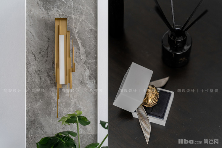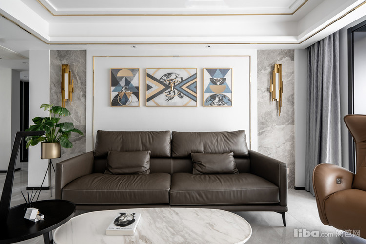客厅作为家的核心部分,同时也是最能体现轻奢感的一个区域。沙发背景墙以墙布和石材两种材质做拼接,增加视觉冲击,同时利用金色装饰让空间看起来不再单调,简约之中,诠释着一份精致。